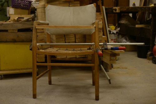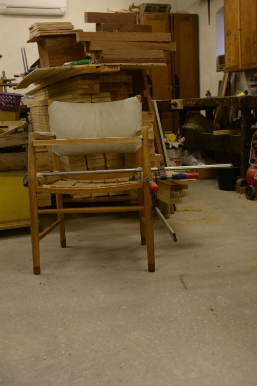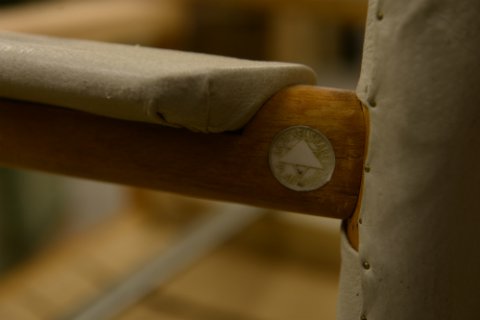 Designerstol på værkstedet. Stolen er en "Rådhusstol" som var blevet løs [...]i samlingerne. Med lidt tålmodighed og det rette værktøj, løses opgaven for kunden.