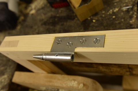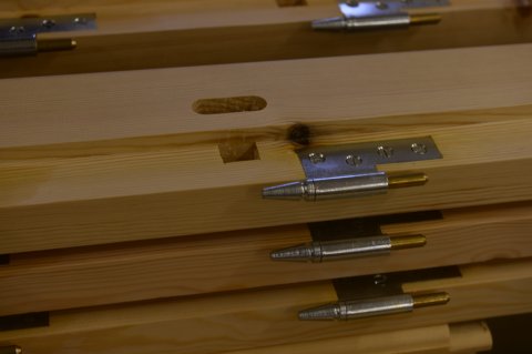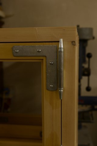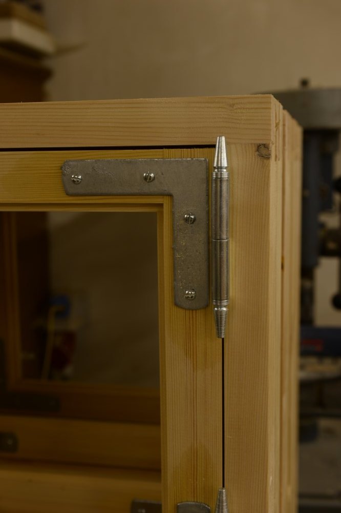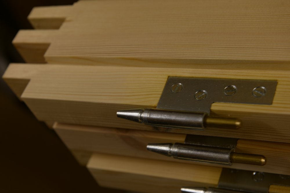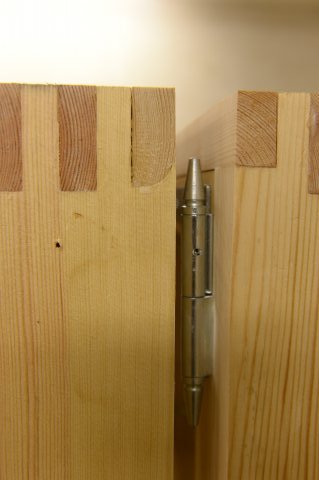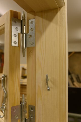 Specialfremstillede hamborghængsler med tårne, nedfældet i karmsidestykke udført i spejlskå [...]ret kernetræ.