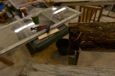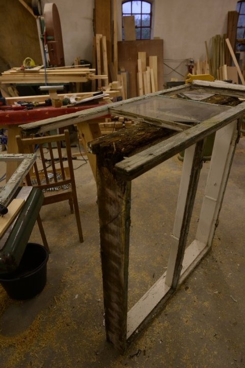 En meget gammel karm (dateret til ca. 1850) fra en fredet gård på Samsø. [...]Karmen skal repareres og udluses med nye dele af fyrretræ i spejlskåret kernetræ.
